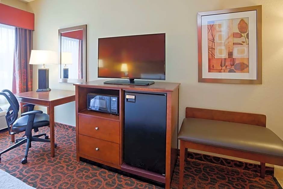 This hearing accessible, non-smoking room features one king-sized bed. The room also has a visual alarm and notification devices for the doorbell or door knock and incoming phone calls. The room features our clean and fresh Hampton bed, comfortable soft seating, microwave, refrigerator, a HDTV, and easy to operate alarm clock/radio. In the bath you will enjoy a WaterPik showerhead and curved shower rod. The free WiFi will help you stay connected while on the road. If you prefer not to work at the desk, you can use the convenient lapdesk instead. You'll also enjoy the convenience of having a coffeemaker with tea service and iron/ironing board in your room. Any corresponding photo may not reflect the specific accessible room type or room feature.